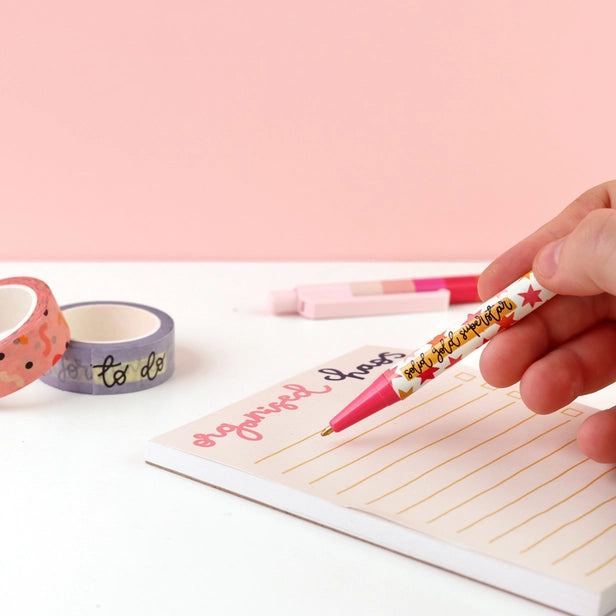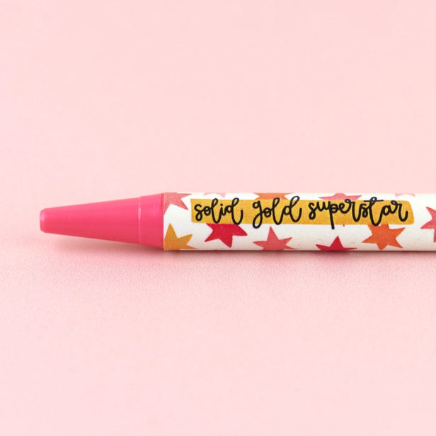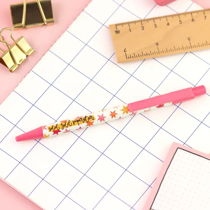 Maak kennis met onze "Solid Gold Superstar" balpen! Met vloeiende zwarte inkt en een soepele schrijfervaring is deze pen jouw stralende bron van creativiteit.