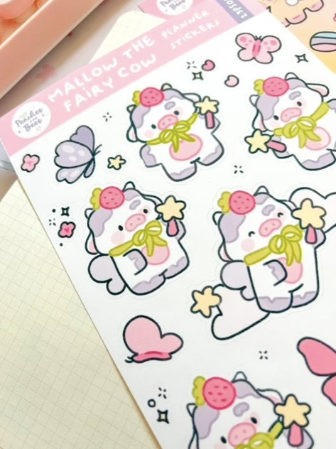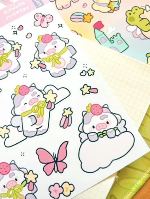 Stap in een wereld vol betovering met ons Fairy Cow stickervel! Laat je fantasie de vrije loop terwijl je het sprookjesachtige rijk ontdekt waar Cow fairies dansen tussen wolken, vlinders en glitters! Deze stickers zijn perfect voor knutselprojecten, journals of elk creatief idee.